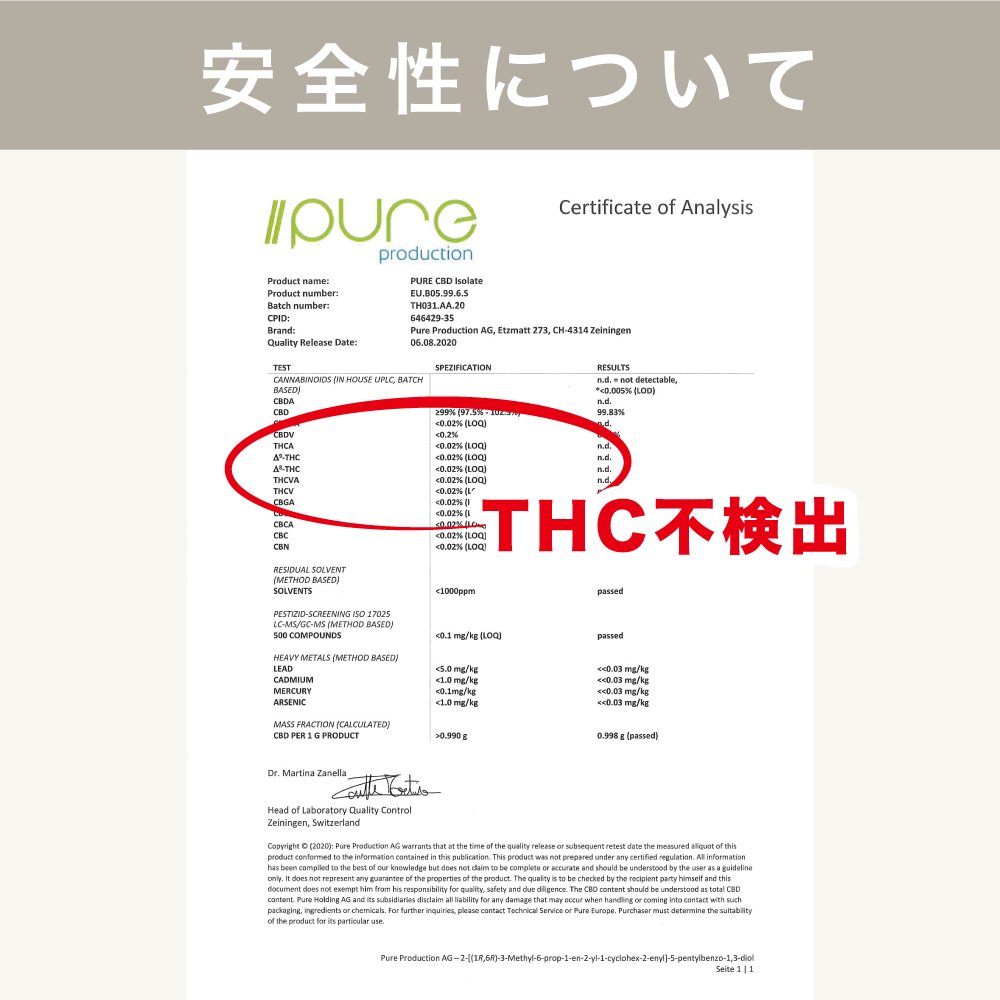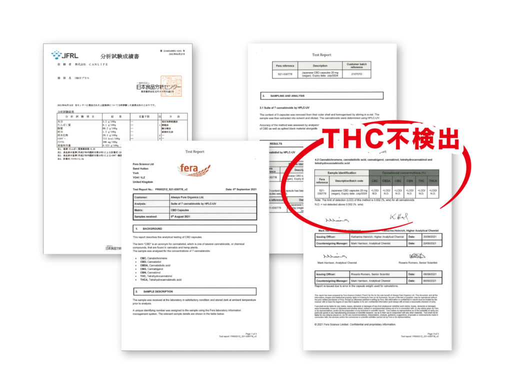 CANLIFEが扱うCBD商品は法律の順守、安全性を最優先に、製造元が作成する製造工程表、成分分析h上、並びに日本国内で扱える「成熟した茎と種子からのみ採れるCBD」である証明書を、輸入ごとに厚生労働省に提出し確認頂いております。